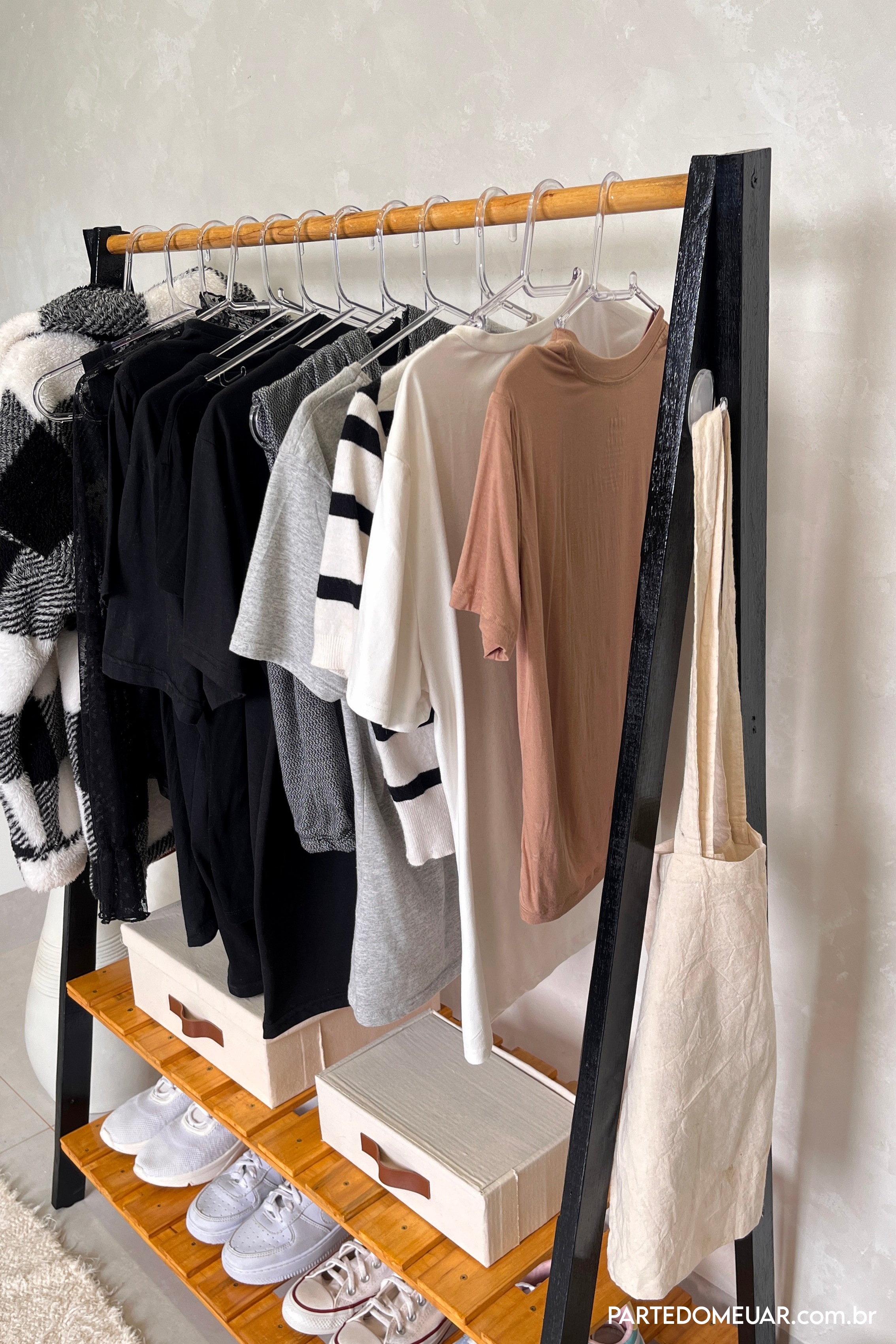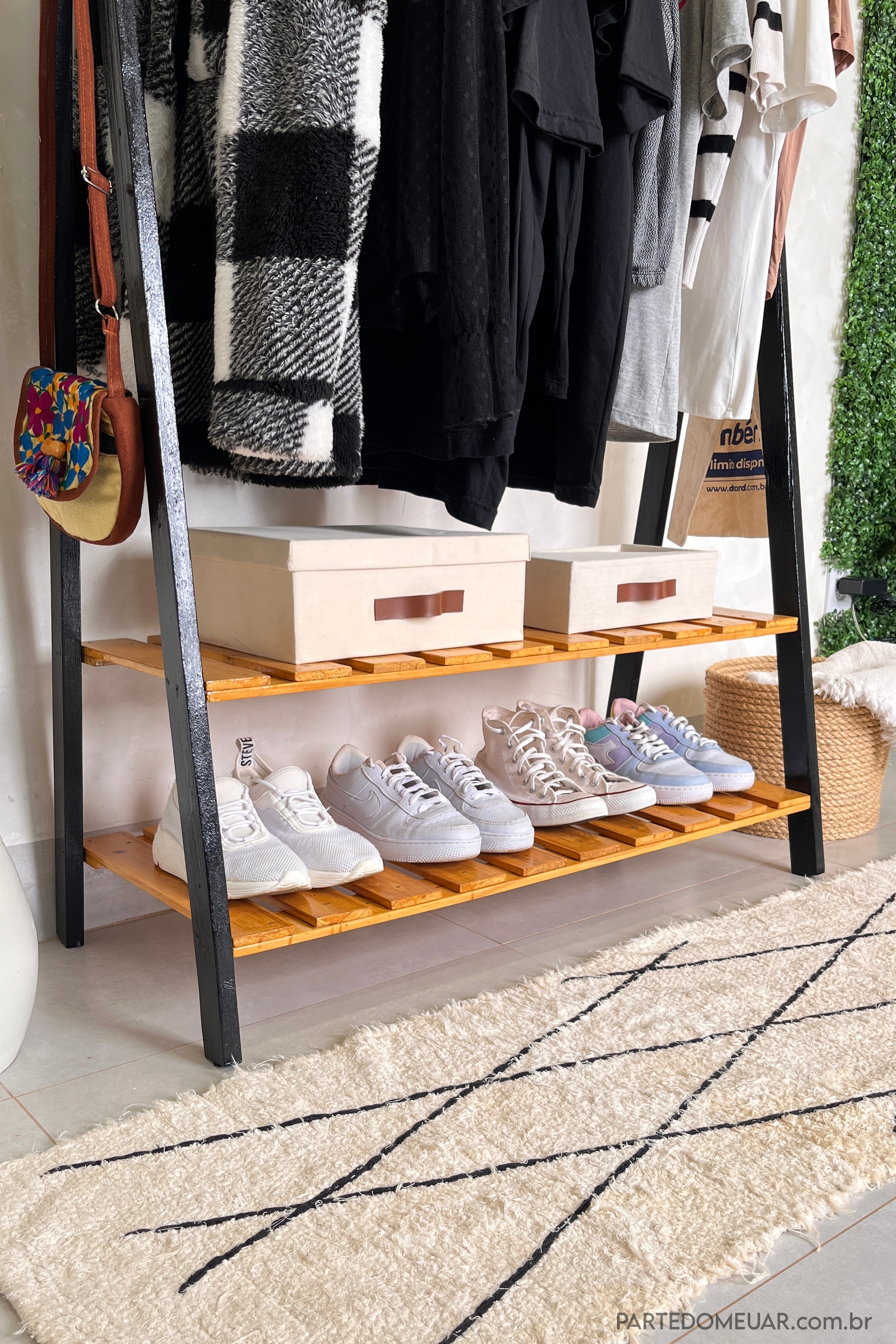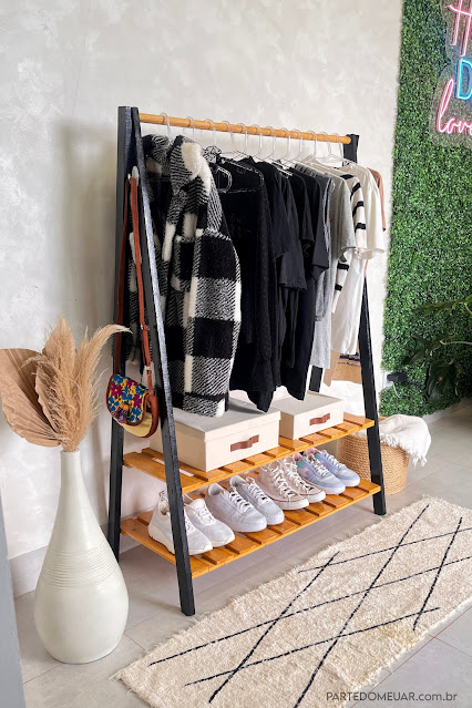 Essa arara de roupas fica linda e cabe muita coisa, entre elas roupas, sapatos, bolsas e caixas organizadoras pra deixar tudo mais bonito e organizado. É uma ótima ideia pra quem tá precisando de um guarda roupa e não pode gastar muito, porque dá pra fazer usando poucos materiais e adaptando com os que você tem em casa.
